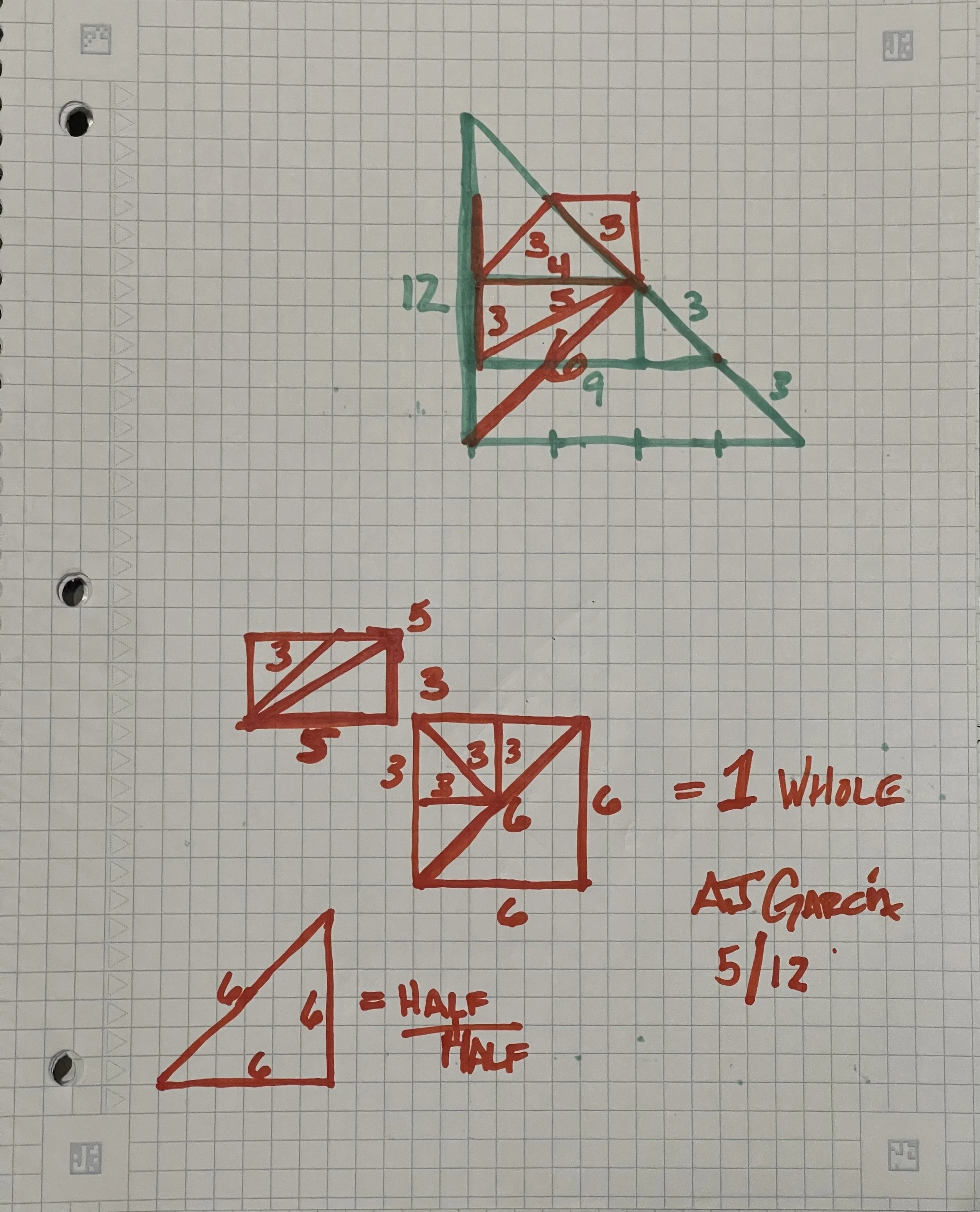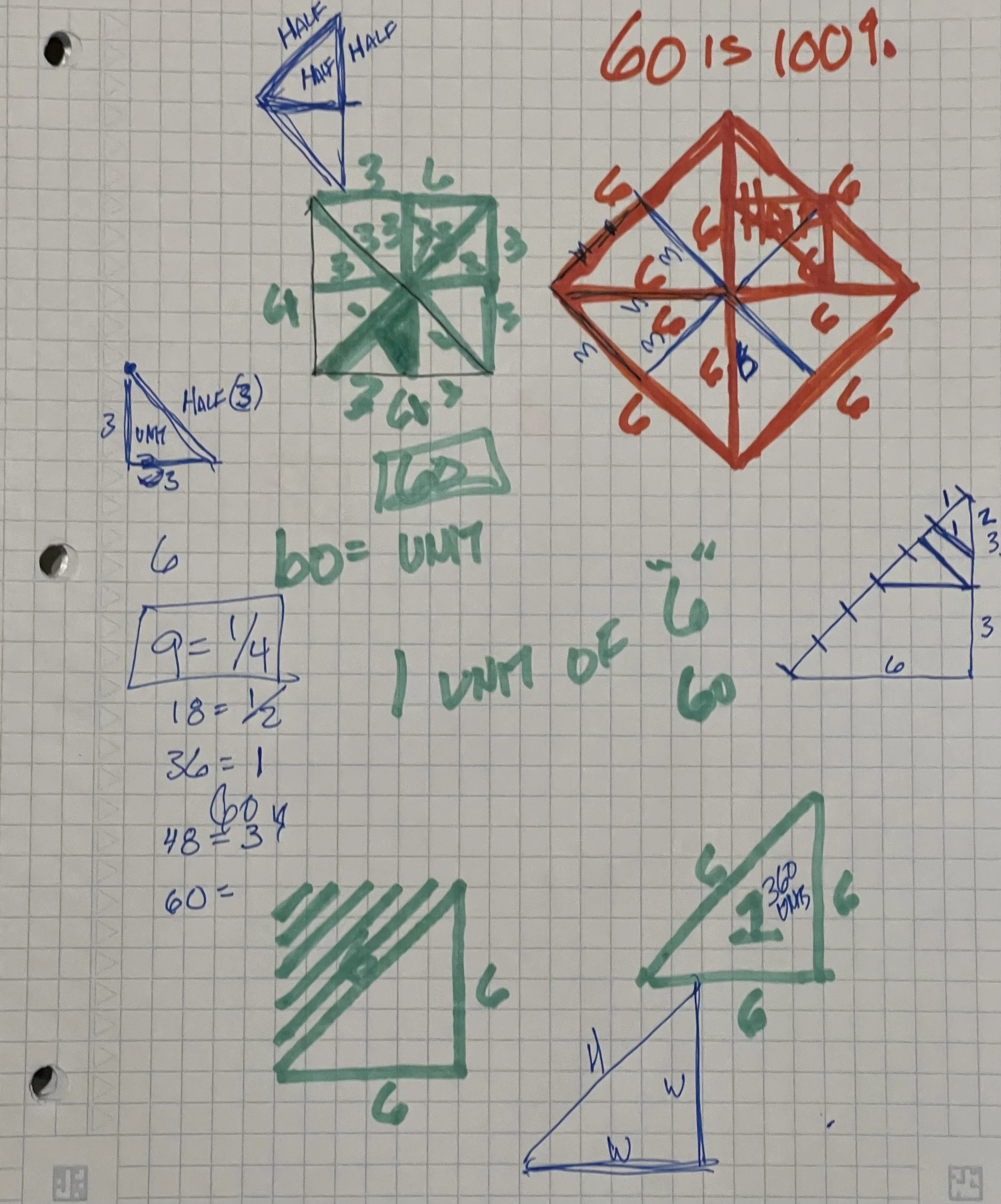 Here is am really putting everything together. And I get to this weird place where i think we need a name for 60 hours. Which is 2 and 1/2 days and now i see 3 groups of 4 fives and four groups of 3 fives and five groups of … you see the 3-4-5 rel;ationship all totaling 60 and then the 3-4-5 Pythagorean triangle.